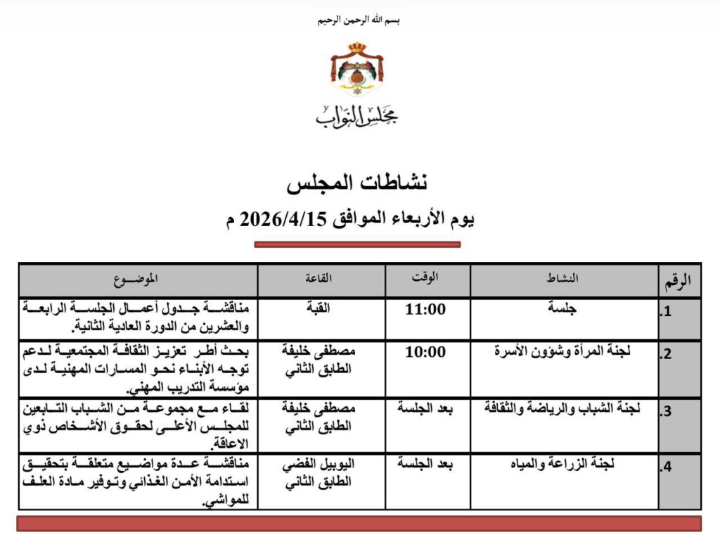 كما يناقش مجلس النواب، قرار لجنته المشتركة (القانونية والخدمات العامة والنقل) المتضمن مشروع قانون المعدل لقانون السير لسنة 2026، بعد أن أقرته الثلاثاء.