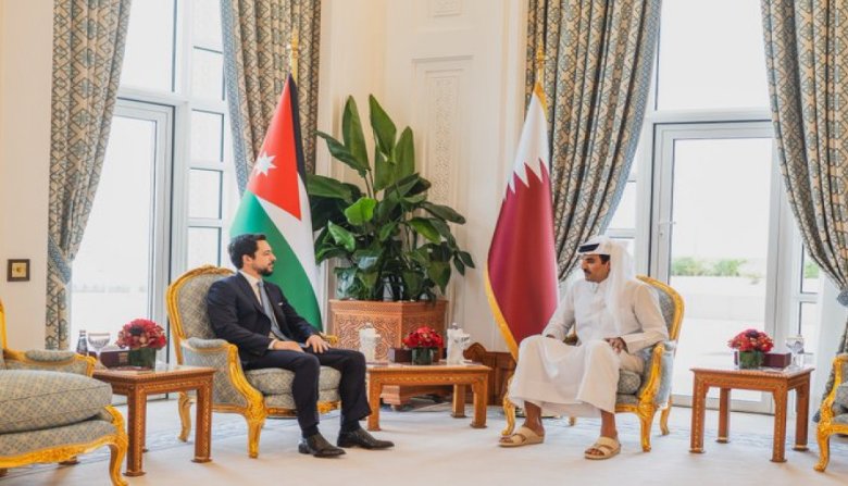 ونقل سمو ولي العهد، خلال اللقاء الذي عقد في الديوان الأميري في الدوحة، تحيات جلالة الملك عبدﷲ الثاني إلى أخيه سمو الشيخ تميم، وتمنياته له بدوام الصحة والعافية، كما حمّل أمير دولة قطر، سمو ولي العهد تحياته لجلالة الملك.