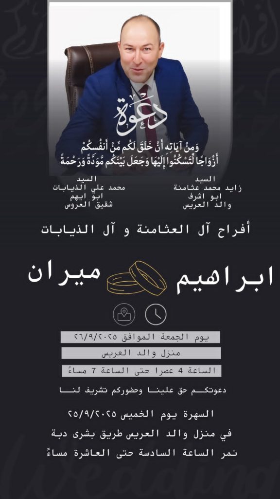 عمان بوست – يتشرف زايد محمد عثامنة بدعوة الأهل والأقارب، والأصدقاء والزملاء والأحباب، لحضور حفل زفاف إبراهيم العثامنة.