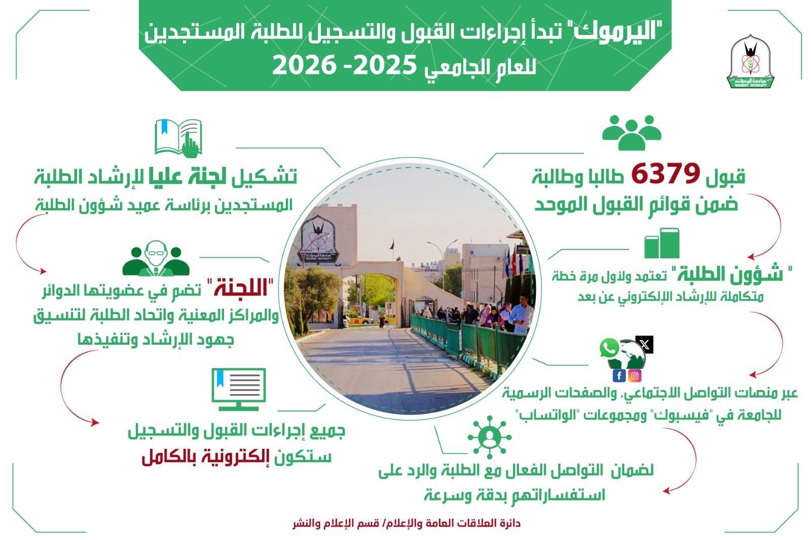“اليرموك” تبدأ إجراءات القبول والتسجيل للطلبة المستجدين للعام الجامعي2025-2026- تفاصيل