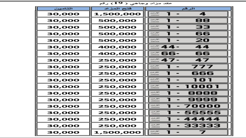 ومن المقرر أن ينطلق المزاد العلني على جميع الأرقام يوم الاثنين المقبل الساعة الرابعة عصراً، وفق قرار مجلس الوزراء الذي خصص عوائد الأرقام المميزة لدعم صندوق الطالب الجامعي.