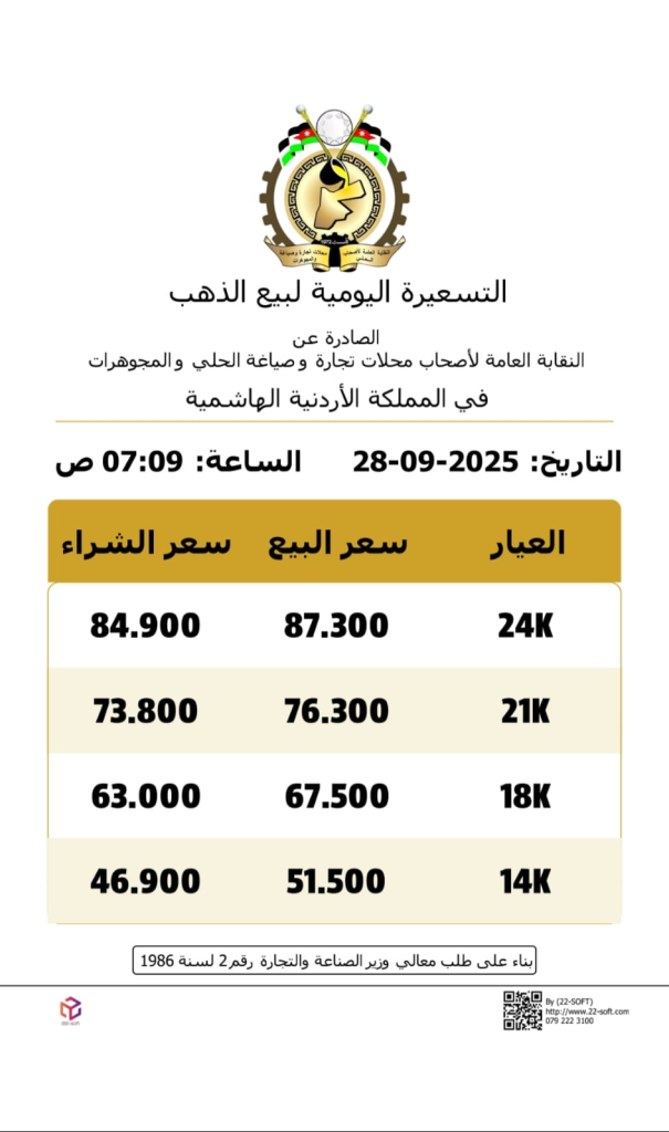 وبحسب النشرة اليومية الصادرة عن النقابة العامة لأصحاب محال تجارة وصياغة الحلي والمجوهرات، فقد بلغت أسعار بيع الذهب في السوق المحلية على النحو التالي: