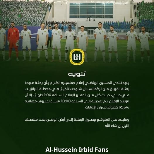 وكان الحسين إربد قد وصل إلى دبي قادمًا من تركمانستان عقب فوزه الكبير على فريق آهال برباعية مقابل هدف ضمن منافسات دوري أبطال آسيا 2، فيما توجه لاعبو المنتخب الوطني من صفوف الفريق مباشرة من دبي إلى تركيا للانضمام إلى معسكر “النشامى”.