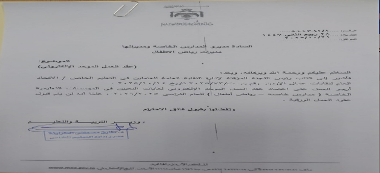 وأكد وزير التربية والتعليم، في كتاب رسمي اطلعت عليه “المملكة”، أن العقد الإلكتروني الموحد سيحل محل العقود الورقية، مشدداً على ضرورة الالتزام به في جميع التعيينات الجديدة.