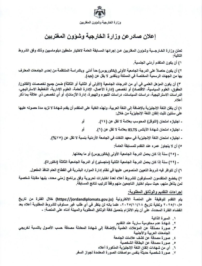 ودعت الوزارة الراغبين في الالتحاق بهذه الوظيفة إلى التسجيل عبر المنصة الإلكترونية: jordandiplomats.gov.jo.