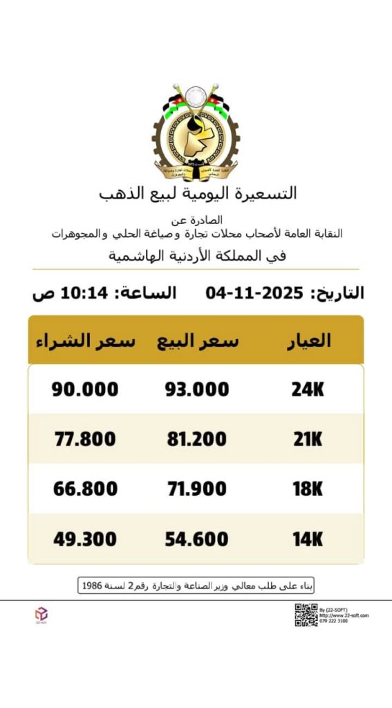 وبحسب التسعيرة اليومية، وصل سعر غرام الذهب عيار 21 إلى 81.20 دينارًا للبيع في محلات الصاغة، مقابل 77.80 دينارًا للشراء.